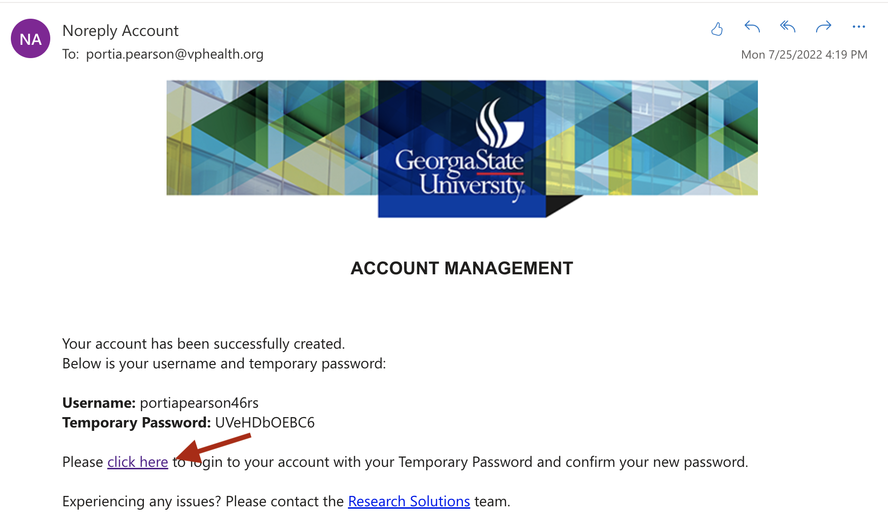 Click the "click here" link in the email to get redirected to the Account Management system (https://rsaccounts.rs.gsu.edu/login).