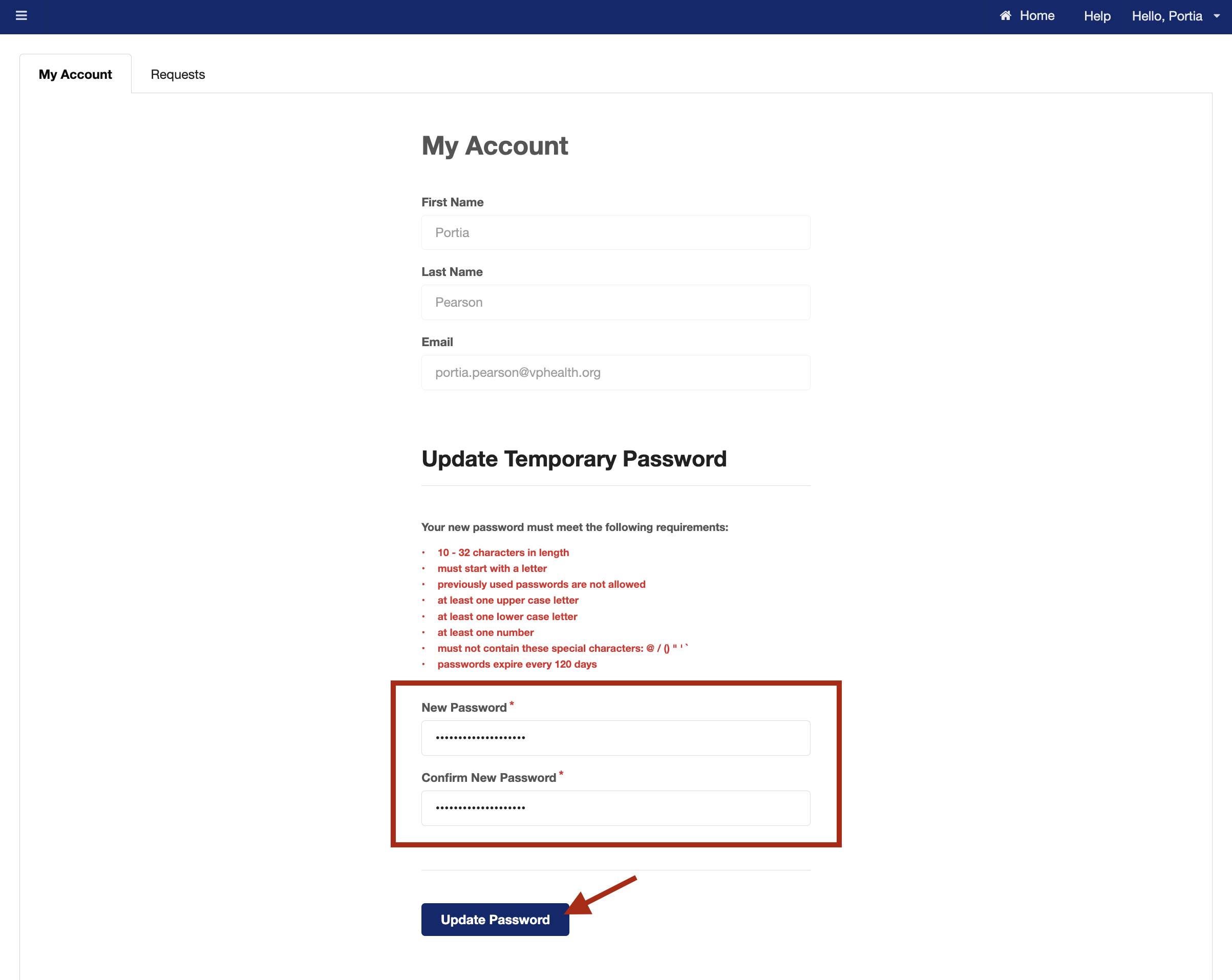 Under the "Update Temporary Password" section, enter your new password then confirm the new password.