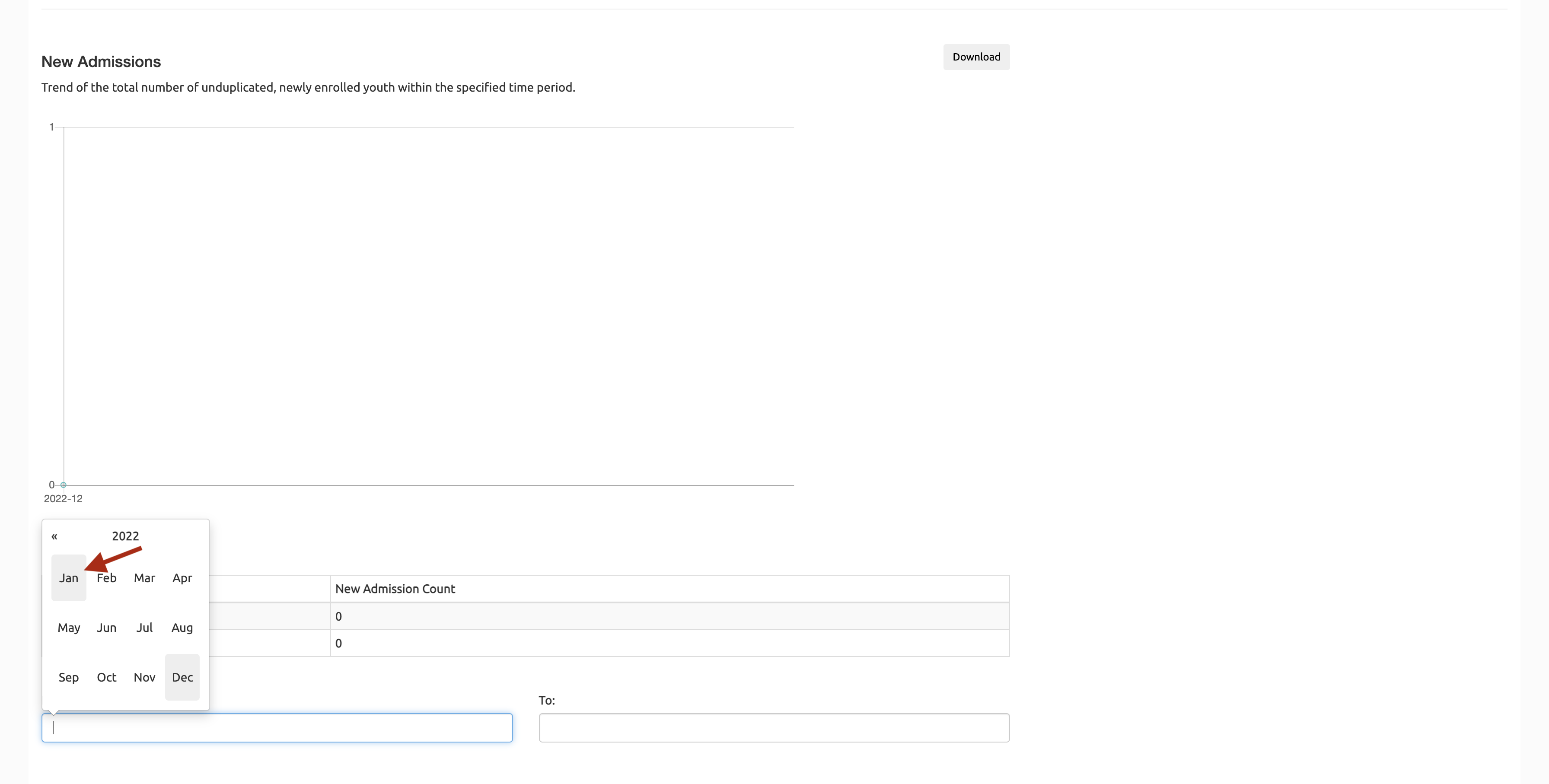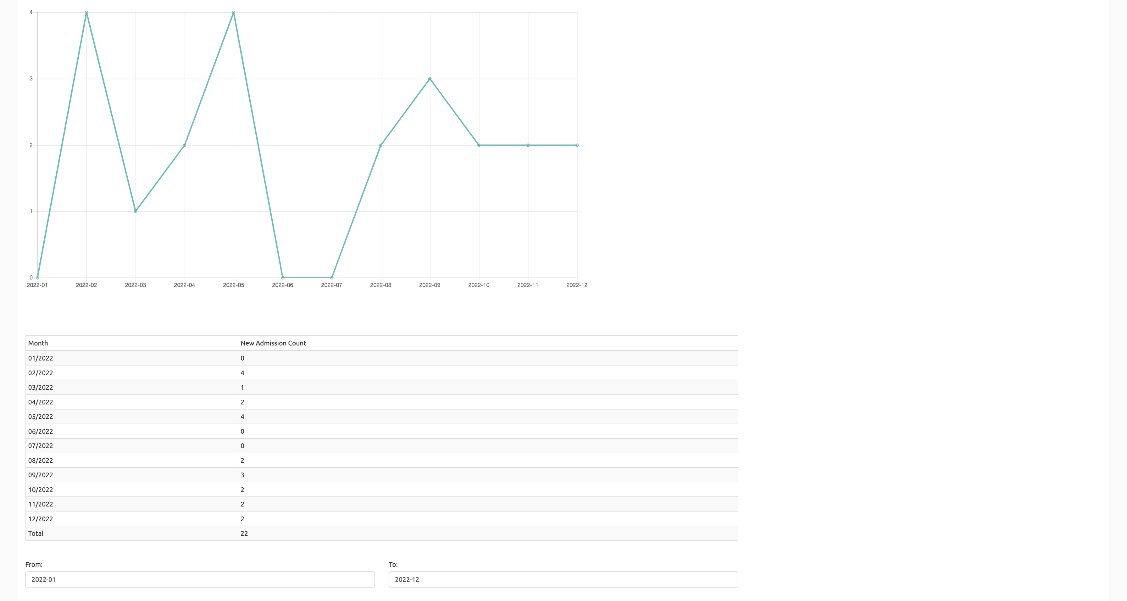 In the Dashboard view, for each graph, select months from the "From" and "To" date fields to display the counts for a specific time range: