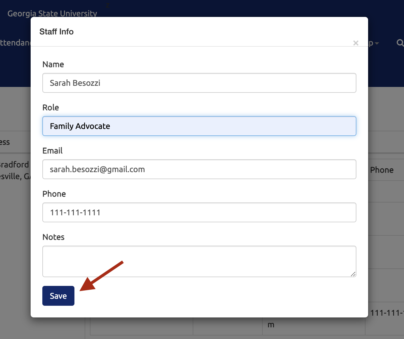 In the Staff Info popup, enter the staff member's contact information and select the Save button: